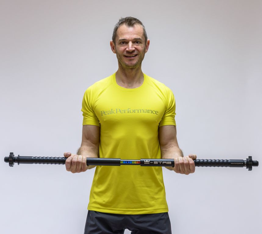 • Arme 90 Grad gebeugt, Ellenbogen am Körper fixieren, den Königstab waagrecht schulterbreit von unten fassen