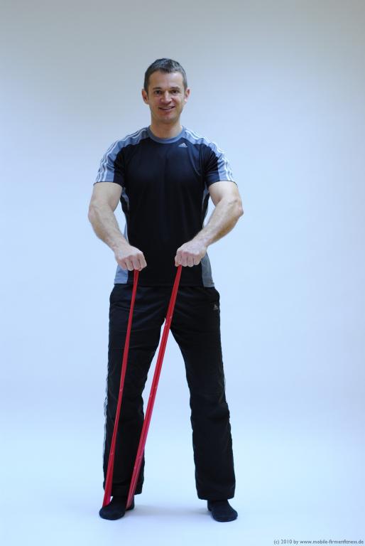 - Arme abwechselnd bis auf Schulterhöhe anheben und senken
