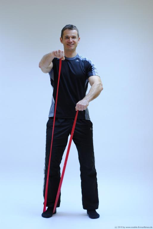 - Ausatmen beim Spannen, Einatmen beim Entspannen des Bandes
